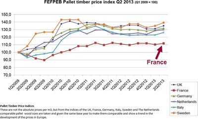 L’indice français CEEB (Centre d’Etudes de l’Economie du Bois) a atteint son sommet fin 2007 à 127,3 alors qu’au second trimestre 2013 il était à 114,4. Selon les observations du SYPAL, il devrait rapidement retrouver son niveau de 2008, soit progresser de 11,3% pour ensuite atteindre son point culminant en 2014. Le syndicat constate également qu’un écart s’est creusé depuis fin 2009 avec l’indice allemand HPE (Holzpackmittel Paletten Exportverpackung) : 16,8 points d’écart au troisième trimestre 2009 et plus du double au deuxième trimestre 2013, avec un écart de 36,7 points (l’indice français CEEB étant resté moyenné au niveau national avec les bois de la tempête Klaus).