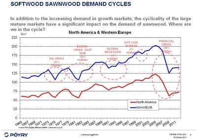 Une forte demande de la Chine que le cabinet de conseil PÖYRY confirme. Selon ce dernier, la consommation de bois résineux a baissé entre 2005 et 2012 de 81 à 68 millions de m3 pour l’Europe de l’Ouest alors qu’elle a augmenté de 21 à 35 millions de m3 en Chine. Ainsi, l’indice mondial des prix des grumes de sciages basé sur vingt régions dans le monde, le WRQ (World Ressouce Quaterly), confirme les prévisions du SYPAL et indique une hausse de quatre trimestres consécutifs.Les hausses les plus fortes sont celles enregistrées dans les pays qui exportent des grumes vers la Chine. La baisse importante de volume de sciages de pays exportateurs comme la Scandinavie, vers l’Europe et la France, au bénéfice (en direction) de l’Asie, conduisent à des tensions en volume et en prix. Des pays voisins comme l’Italie, le Royaume-Uni, la Belgique, alors en recherche d’approvisionnement, importent des billons en provenance de la France.